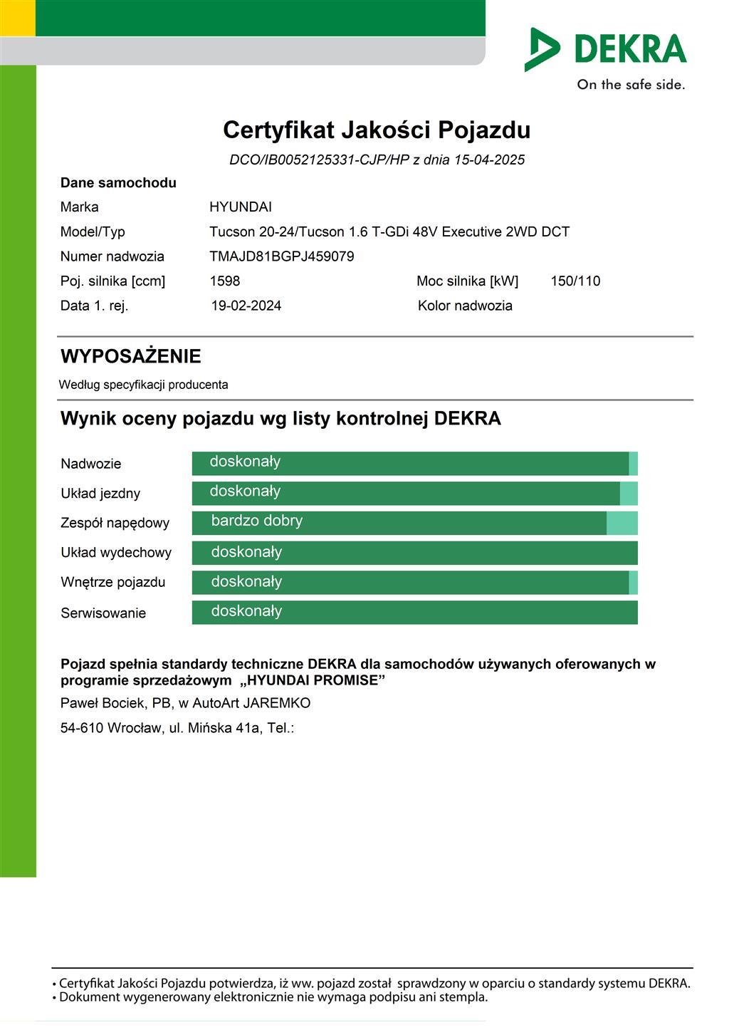 - Certyfikat Jakości z kontrolą 100 punktów pojazdu